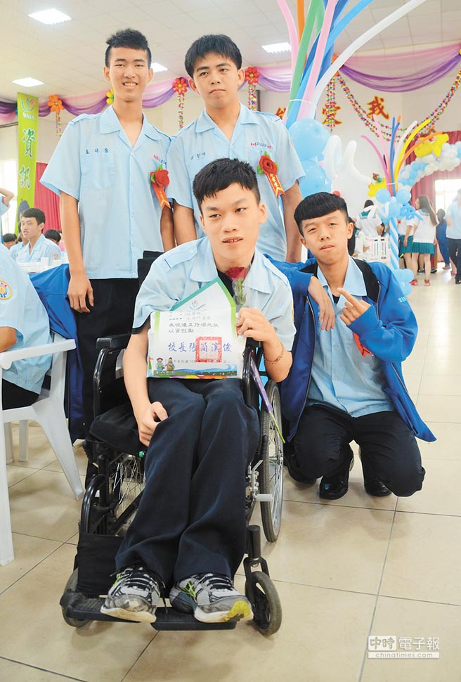 14日畢業典禮上,書群母親特地放下工作,全程出席,她欣慰地說,兒子雖不良於行,但生性樂觀,尤其對喜愛的電腦特別鑽研,班上同學只要電腦、手機出問題、中毒,就會找他幫忙,同儕相處零距離,特別是和盧峙葆、田哲瑋早建立起革命情感,3人就像親兄弟一樣。