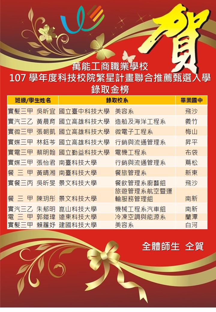 恭賀 汽三乙 黃晨育 等多位錄取107學年度國立科大