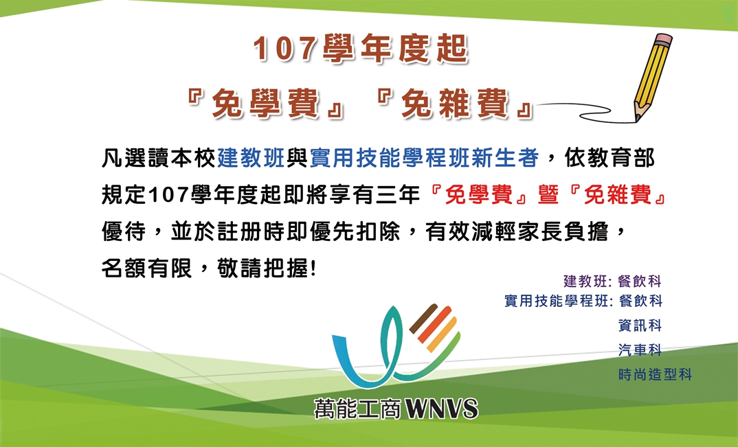 107學年國中生就讀本校建教班、實用技能班三年「免學費」「免雜費」