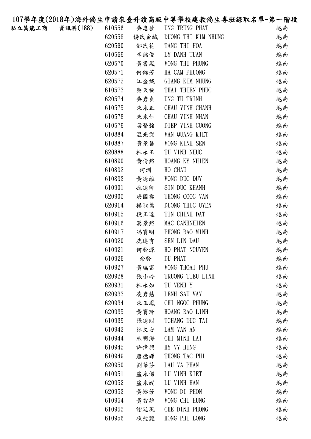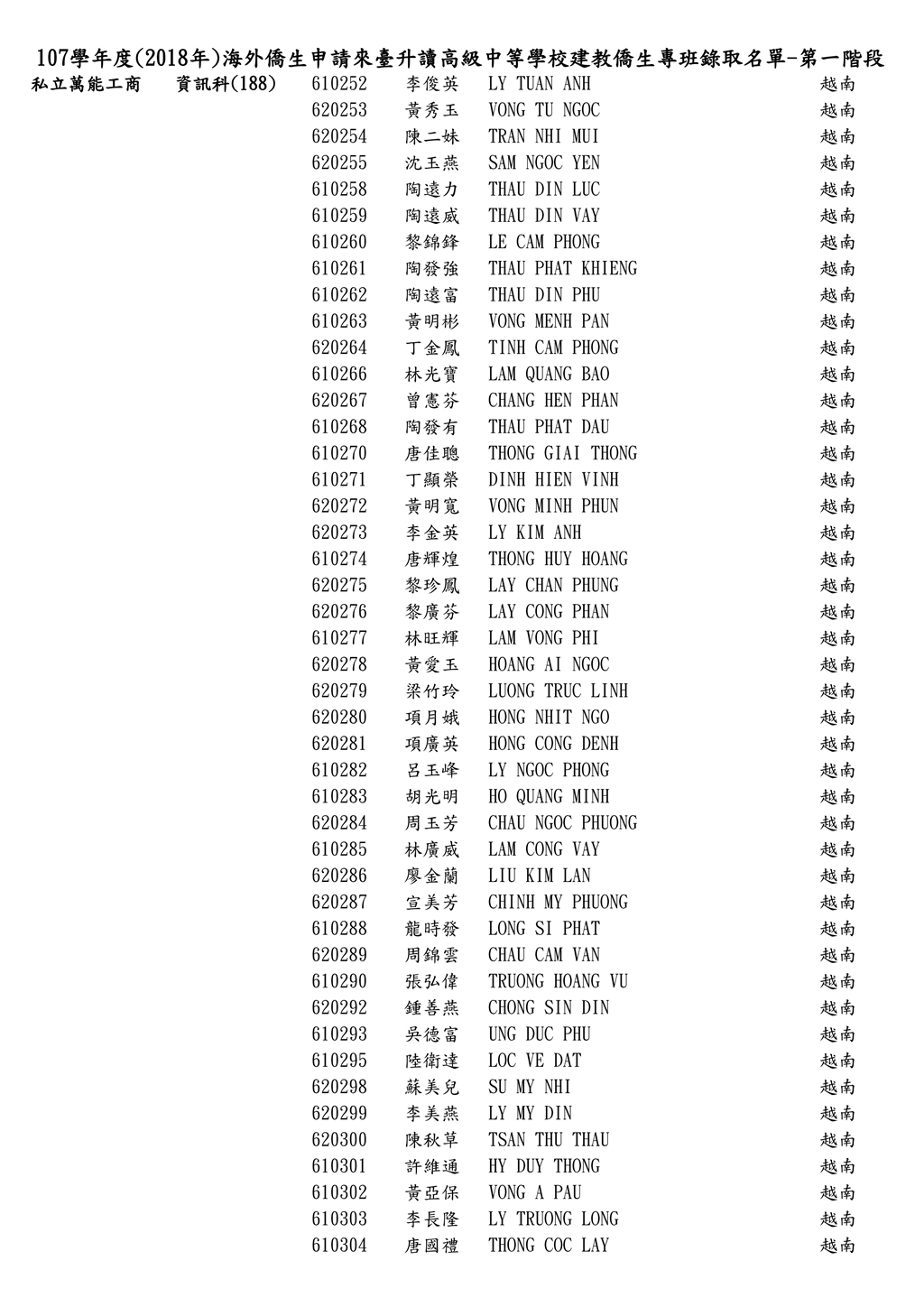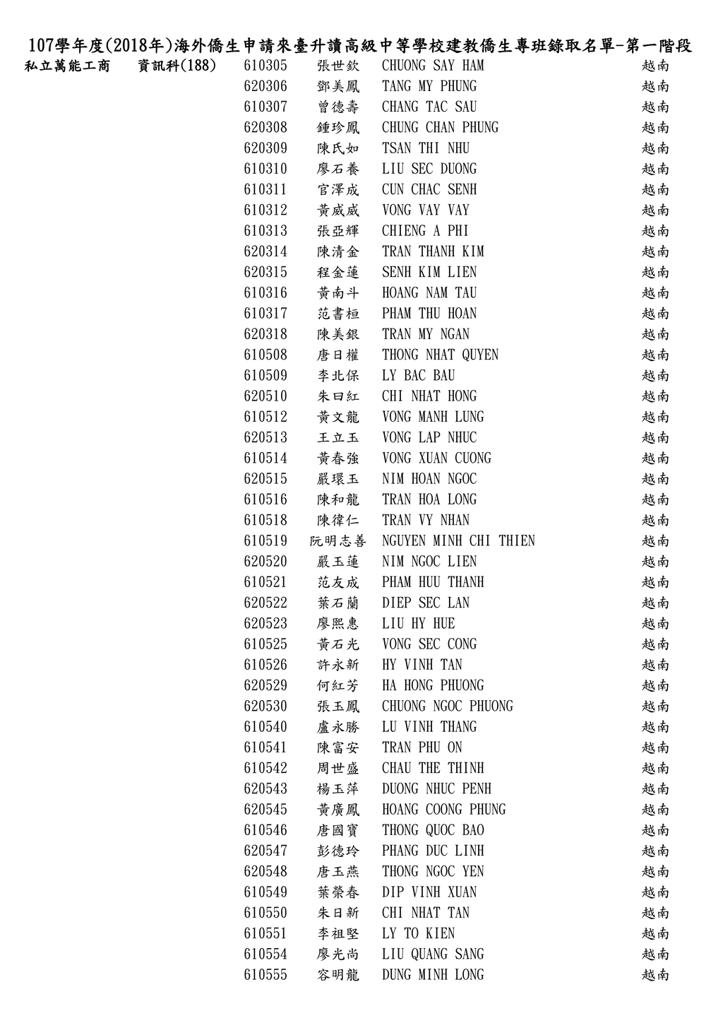 107學年度僑生申請來臺台升讀僑生專班錄取名單_第一階段