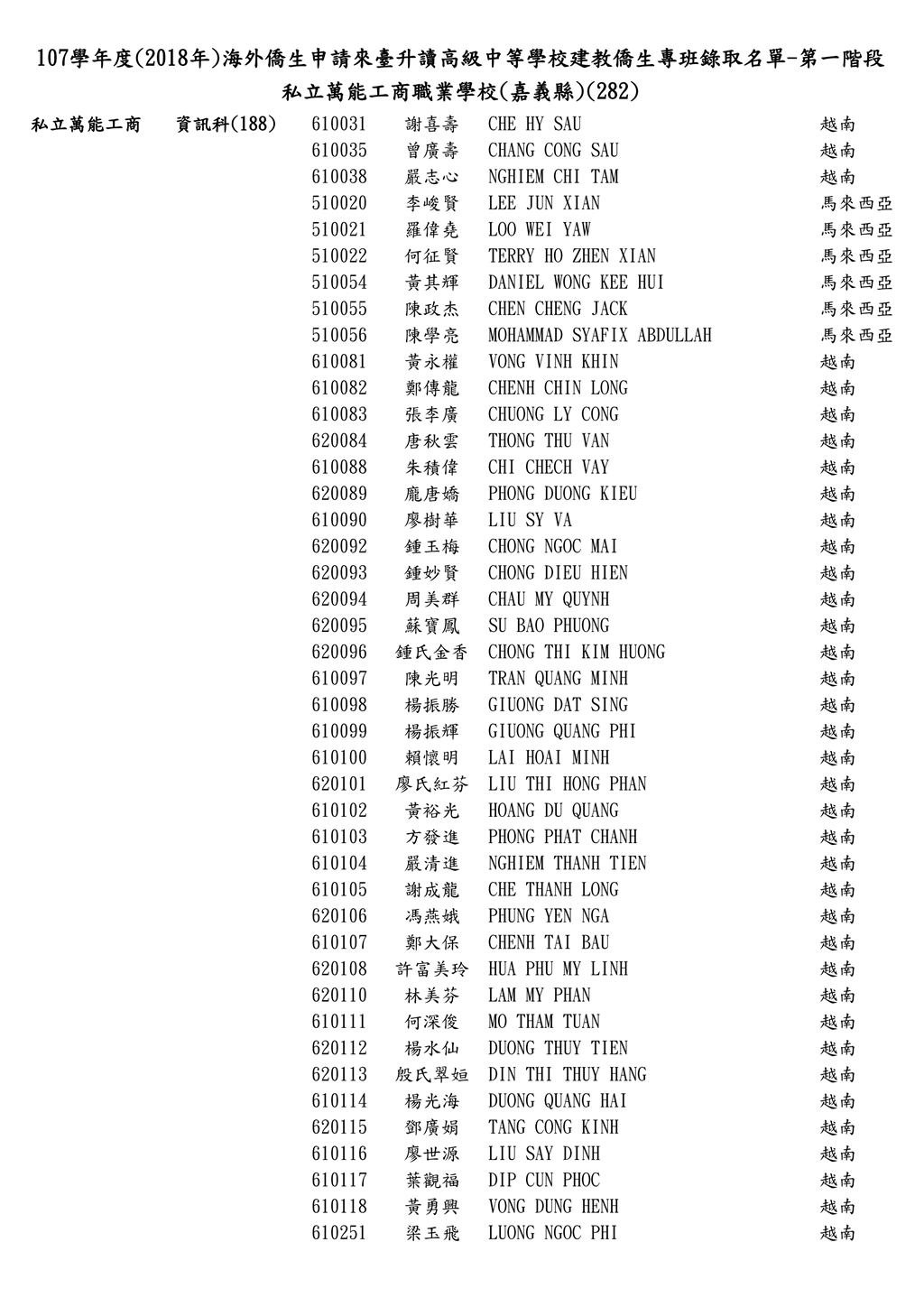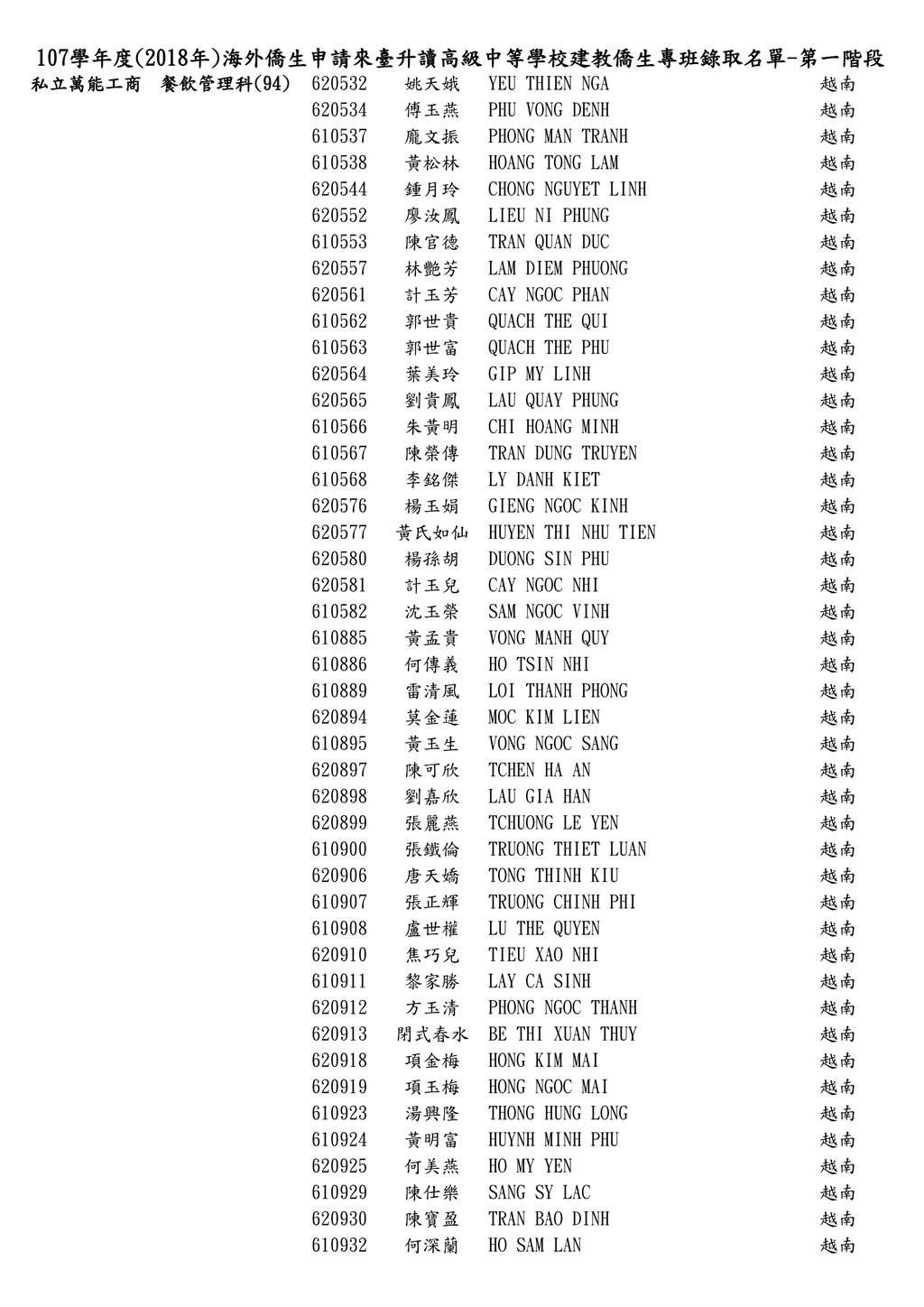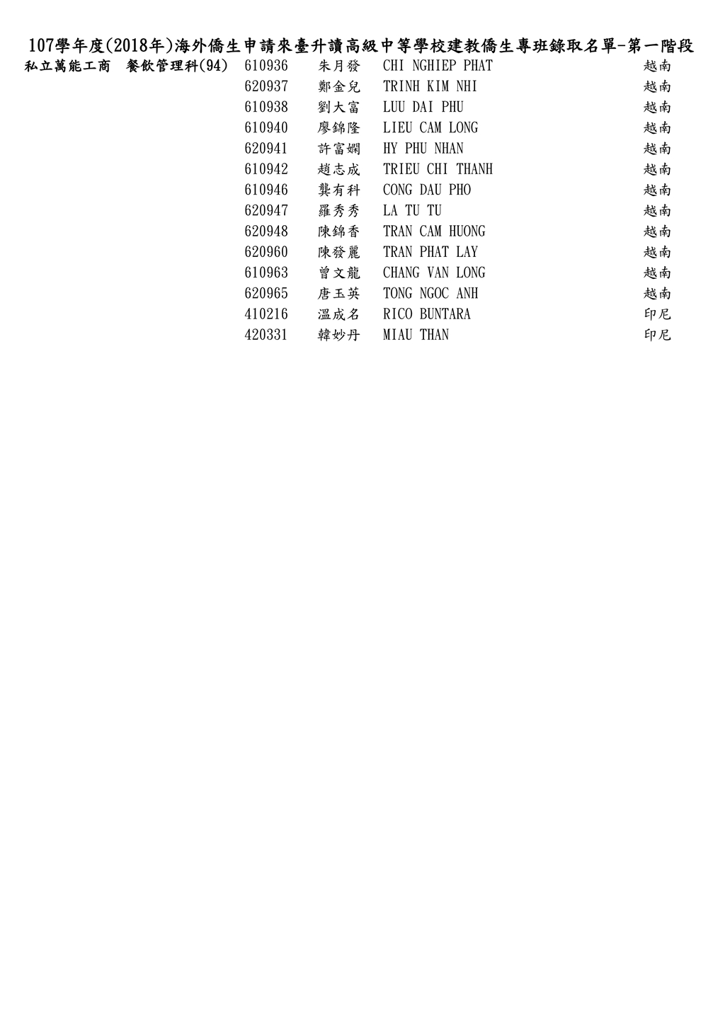 107學年度僑生申請來臺台升讀僑生專班錄取名單_第一階段