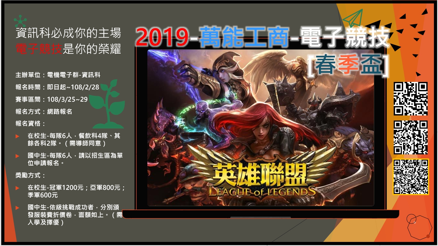 | 標題 | 2019-萬能工商-電子競技大賽LOL [春季盃] 開始報名了 | 相關網址 | 有 | 人氣 | 24221 |
