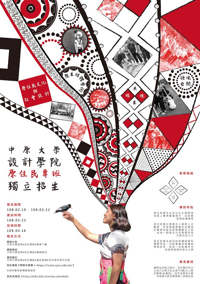 | 中原大學108學年度設計學院設計學士原住民專班單獨招生海報1份 一、旨揭專班主要培育具有原住民傳統文化為主體意識及現代設計學科與數位技能整合之新世代原住民人才。 二、招生簡章公告於本校網頁,考生可自行上網(https://www.cycu.edu.tw/點選「招生專區」至「簡章下載」網頁)查閱或列印,報考者須具有原住民族身分。重要日程參考如下: (一)報名期間:108年2月19日上午9時起至3月12日中午12時止。 (二)審查資料繳交期限:108年3月12日前。審查資料可郵寄或至本校現場繳交。 三、報考相關事宜請參閱簡章說明或洽本校教務處招生服務中心,服務專線:03-2652014。 | |||||