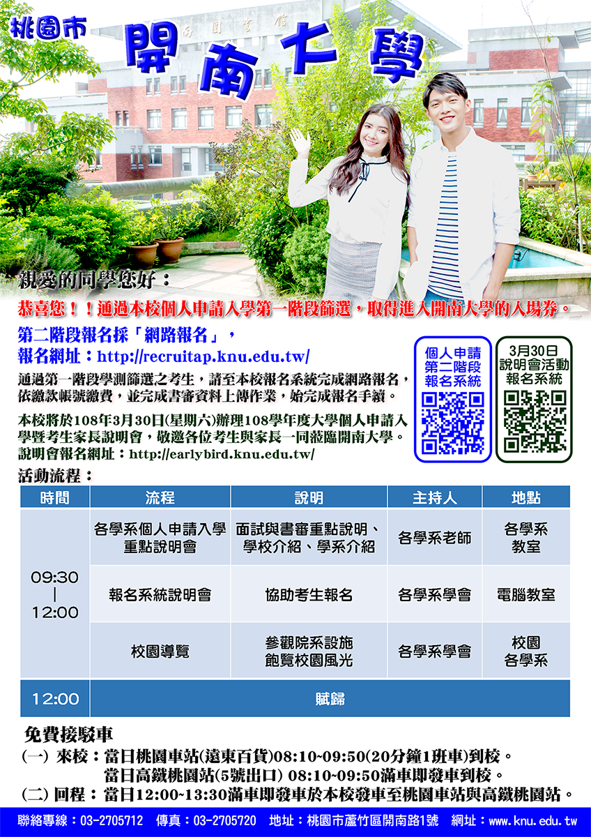 | 一、為落實多元入學理念,本校於108年3月30日(星期六)上午9時30分舉辦「開南大學108學年度個人申請入學暨考生及家長說明會」,以增進考生與家長對於升學資訊之理解,活動介紹如附件。 二、當日於桃園火車站與高鐵桃園青埔站皆備有免費接駁車來回接送。 三、敬請貴校協助公告轉知通過繁星推薦錄取及個人申請第一階段篩選進入本校之貴校在校生暨其家長踴躍參加。無任感荷,至紉公誼。 | |||||