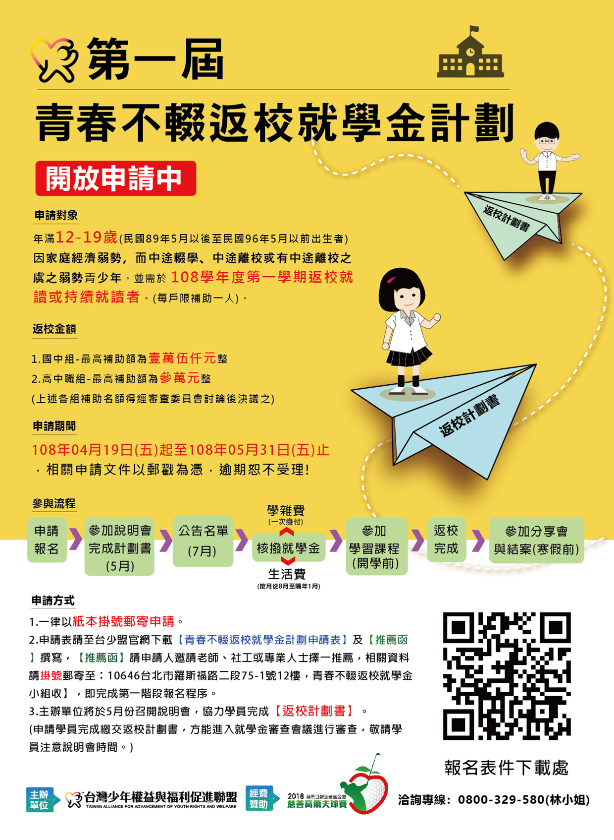 三、該計畫申請於民國108年4月19日至民國108年5月31日止,詳細申請辦法請見活動網站:http://www.youthrights.org.tw/new/1185。