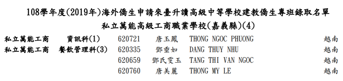 108學年度海外僑生申請萬能工商錄取名單(第二次分發)