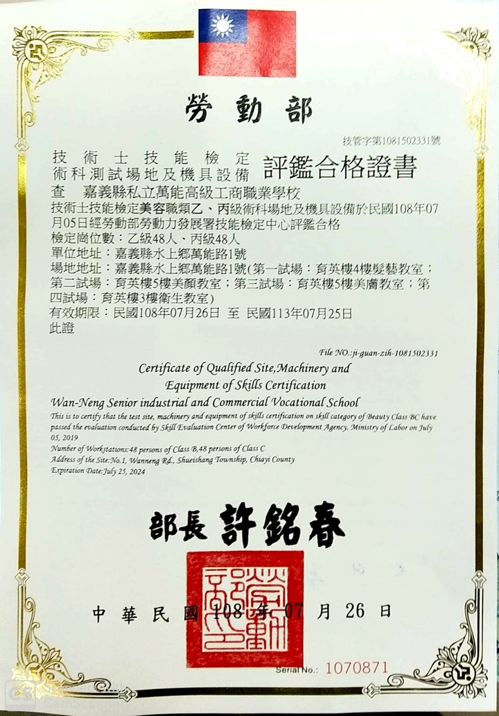恭賀 時尚造型科 持續通過勞動部《美容乙、丙級》合格檢定場地
