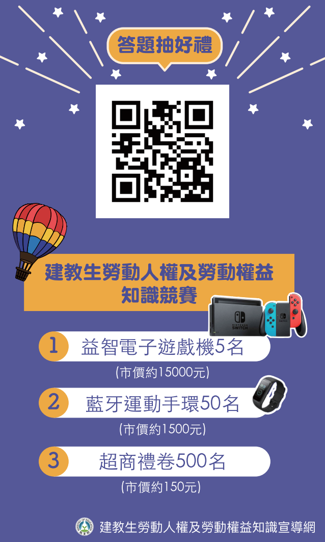 並舉辦建教生勞動人權及勞動權益知識競賽,活動獎品豐富,請各校廣為宣導,