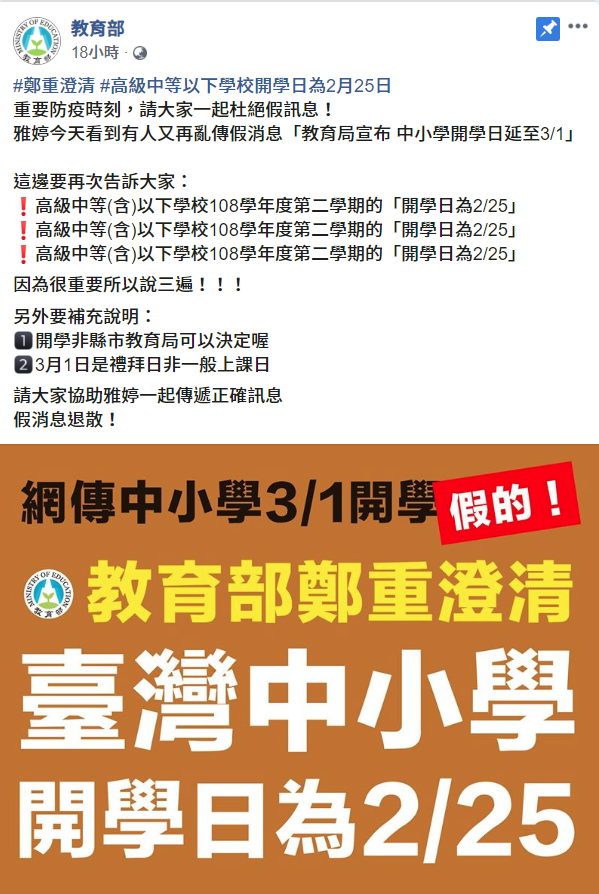 教育部粉粹謠言:108-2高中職開學日為02/25