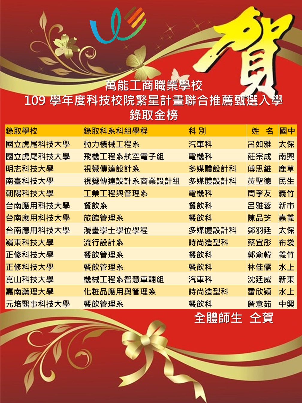 萬能工商109學年度繁星科技大學錄取金榜