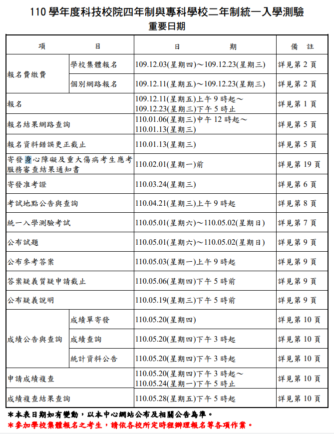 110學年度四技二專統一入學測驗報名時間