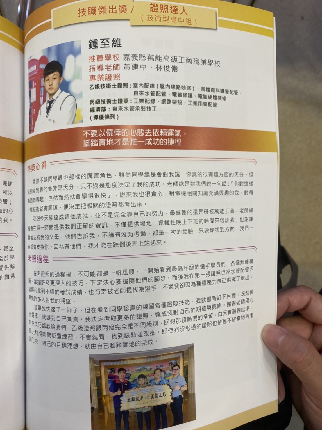 恭賀今年畢業的校友鍾至維榮獲「技職之光」