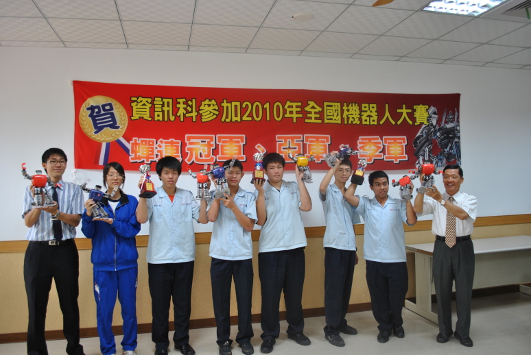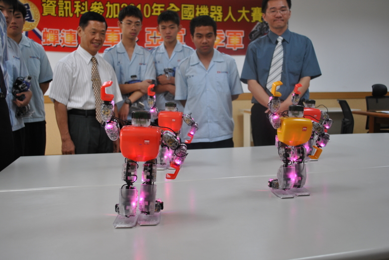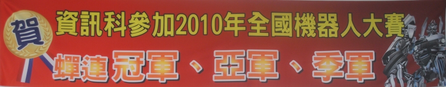 本校資訊科日前參加教育部在黎明技術學院盛大舉行之「二0一0年全國智慧型機器人大賽」,於五百多對參賽隊伍中,在「機器人賽跑」項目中再次締造佳績,蟬連了前冠軍、亞軍、季軍三名,成績十分亮眼。消息傳來,全校師生莫不歡欣慶賀。