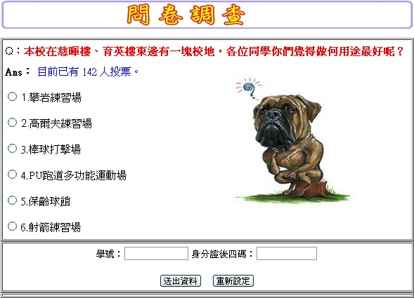 | 標題 | 請全校同仁、學生上網填問卷調查。 | 相關網址 | 有 | 人氣 | 21478 |